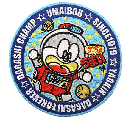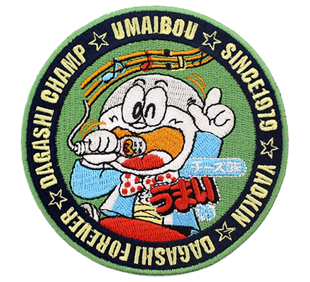 うまい棒のキャラクターをデザインした、アイロンで付けられるワッペンです。