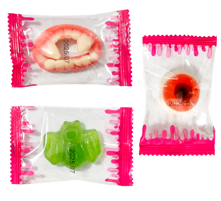 コウモリ、ドラキュラの口、目玉!ハロウィンにぴったりなユニークな形のグミのアソートパックです。
