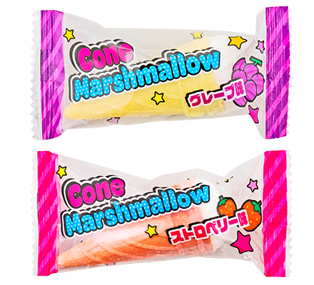 三角コーンにストロベリーとグレープ風味のゼリー入りのハロウィンにぴったりなふんわりマシュマロです。