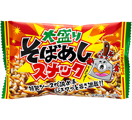 ソースと青のりの風味香る、米パフとスナック麺を混ぜたそばめし風スナックです。